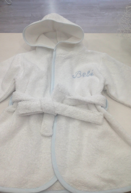 Tessuto spugna 100% puro cotone bordato con sbiego in piquet millerighe. Ricamo a punto erba su spugna . Personalizzabile in tutti i colori