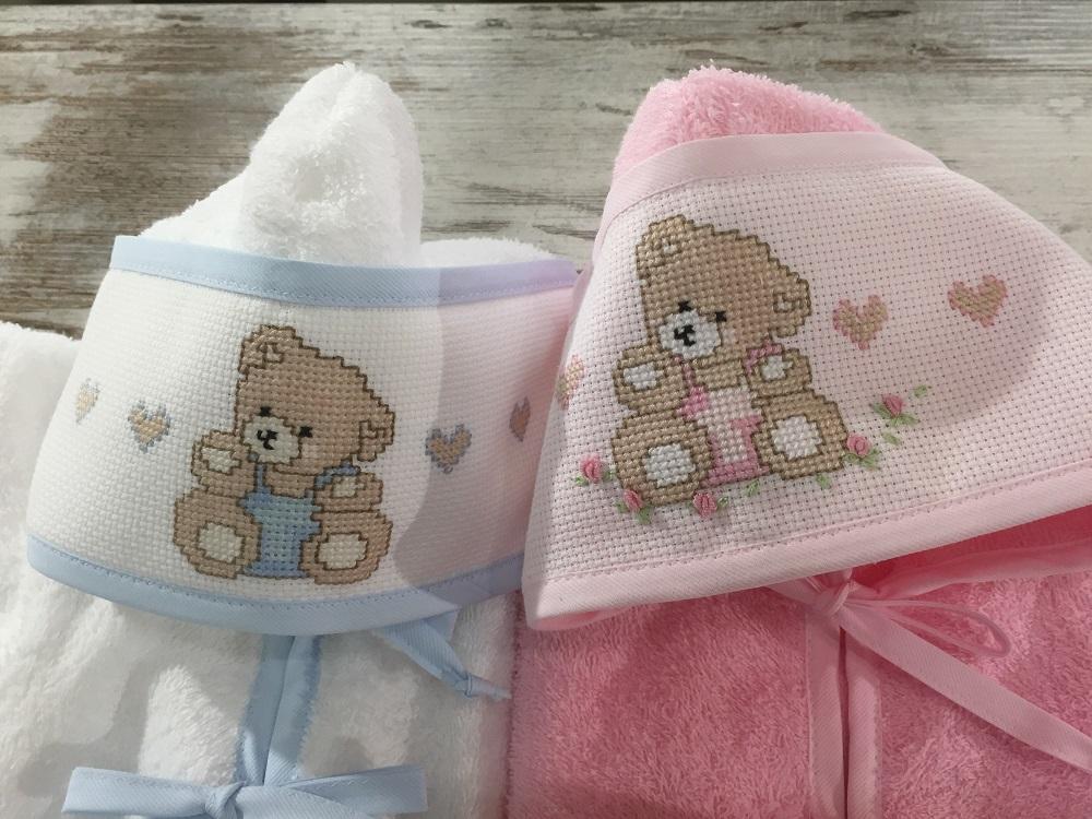 Tessuuto spugna 100% puro cotone. Bordato con sbiego in piquet millerighe. Ricamato a mano punto croce fiori punto vapore.