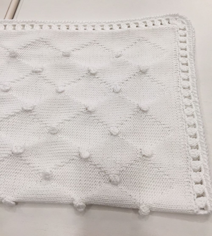 Cotone 100% fatta interamente a mano con punto operato con palline rifinita all'uncinetto.