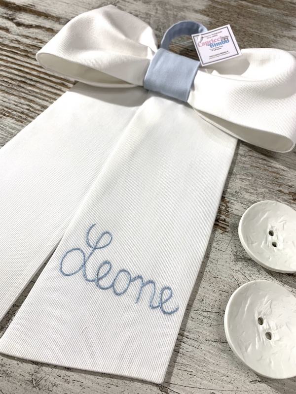 Semplice ed elegante fiocco nascita in piquet millerighe bianco.