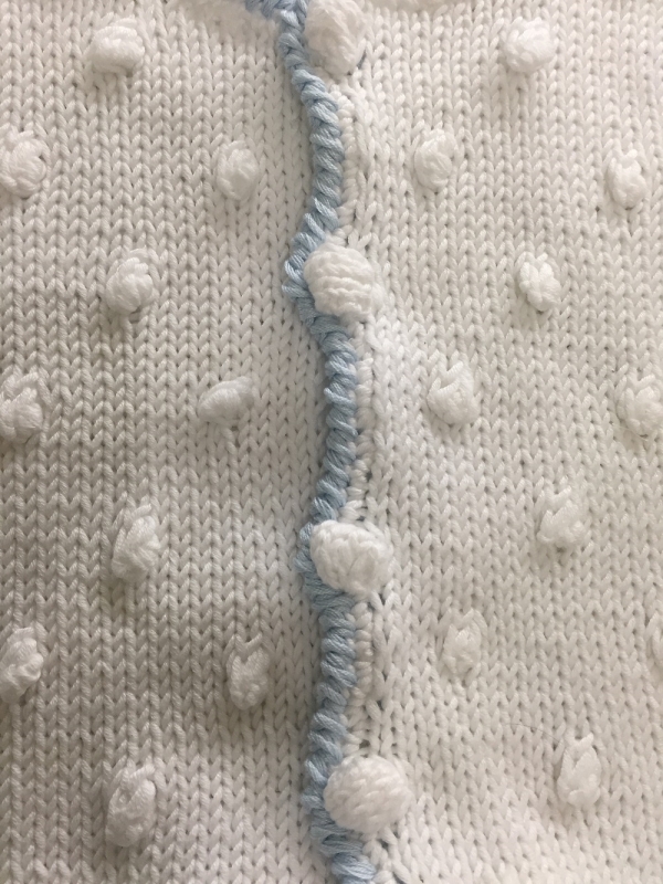 Bordato a punto gambero in azzurro.