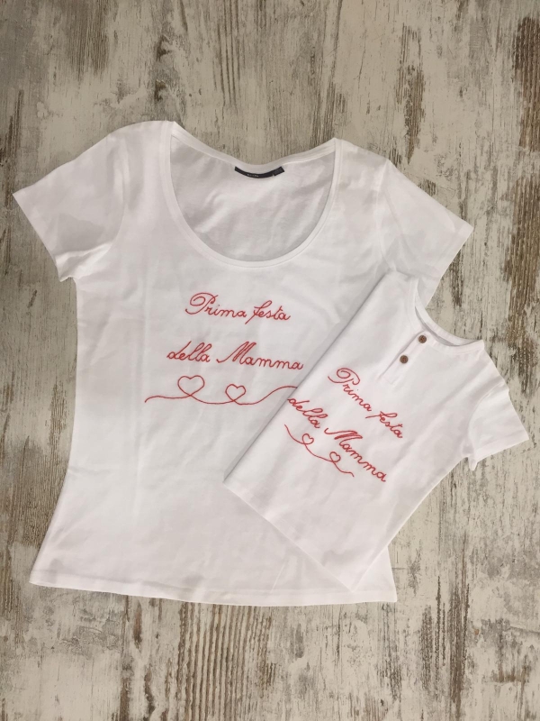 Ricamo a punto erba su maglietta in 100% puro cotone.